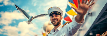 Realistic scene of a male cruise ship captain smiling and waving, with a seagull flying past and vibrant banners hanging on the ship in the background, banner