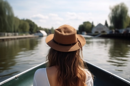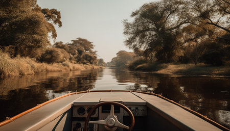 Summer adventure sailing on a tranquil canal, surrounded by nature generated by artificial intelligence