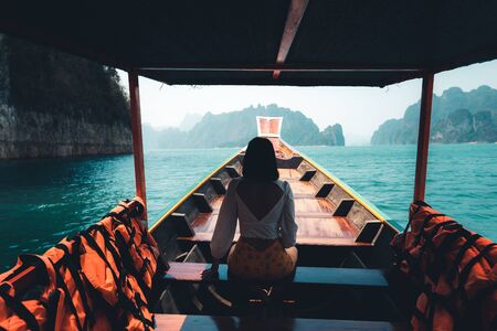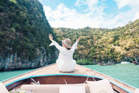 Happy Woman tourist in private longtail boat trip to koh Hong lagoon island at Krabi, Thailand. landmark, tropical destination, southeast Asia Travel, summer vacation, wanderlust and holiday concept