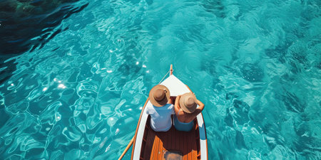 Two beautiful young girls with their backs on a boat are relaxing and having fun. Have fun together and enjoy the sun while swimming in the sea. vacation yachting travel concept