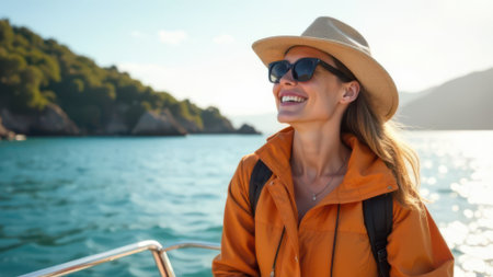 Smiling female tourist wearing sunglasses and hat enjoying a boat trip in a beautiful bay, surrounded by stunning scenery and clear blue waters