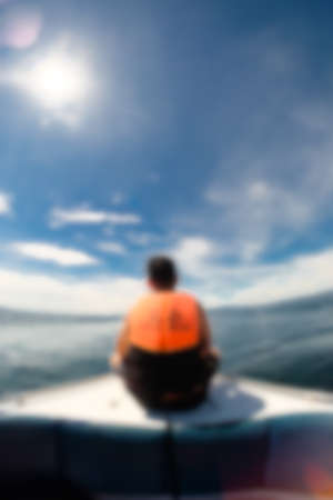 nostalgic sad girl or lonely woman looking the sea from little boat in a sunny day