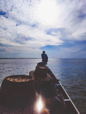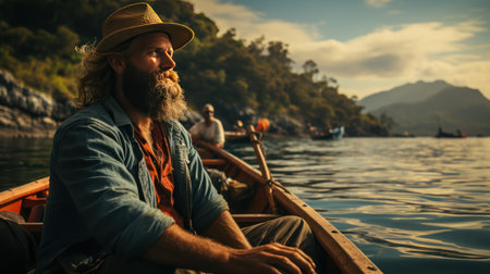 Generative AI Image of Asian Man Sitting Smiling on Boat in Sea Ocean Landscape at Twilight