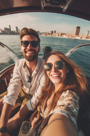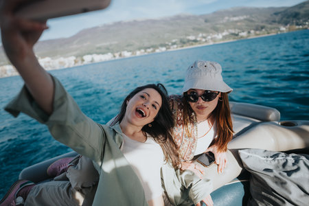 Two joyful women taking a selfie on a boat with a scenic sea backdrop