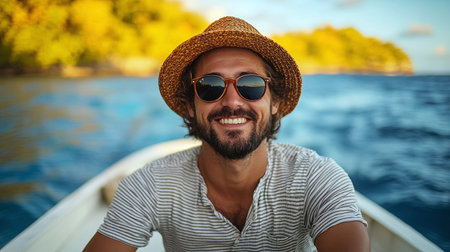 Generative AI Image of Western Man Wearing Sunglasses Hat Sitting Smiling on Boat in Ocean in Summer