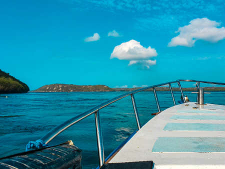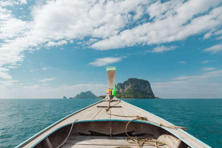 Traveling in Thailand. Amazing view from over Thai traditional wooden longtail boat travel on the sea tropical island with scenery of beautiful sea and sky.