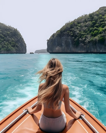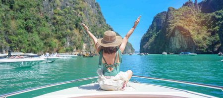 Woman tourist on boat trip, happy traveller relaxing at Pileh lagoon on Phi Phi island, Krabi, Thailand. Exotic landmark, destination Southeast Asia Travel, summer vacation and holiday concept