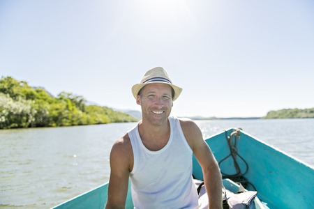 Young man wearing sunglasses and bucket hat smiling during excursion on a traditional banca boat in Siargao, Philippines