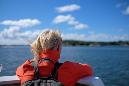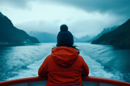 Woman wearing a vibrant red jacket and cozy wool hat, enjoying a scenic ferry ride through the stunning Norwegian fjord landscape
