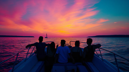 Summer lake adventure, friends on a boat, relaxing and taking in scenic landscapes.