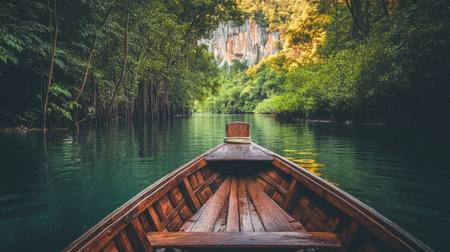 A tranquil view from the bow of a wooden boat navigating through a lush river canyon. Surrounded by vibrant greenery, this serene landscape invites exploration.
