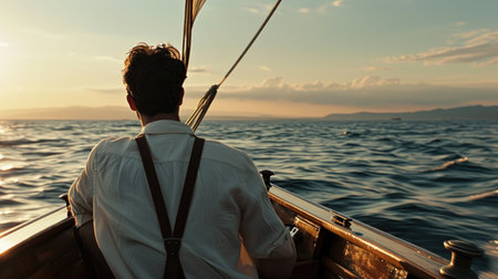 An AI generated illustration of Woman on boat bow looking at sail and water