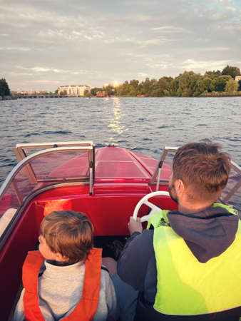 Father and son riding motor boat wearing safety vests having a ride in Neva river, Saint Petersburg