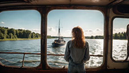Woman on Ferry with City Skyline A Symbol of Freedom, Adventure, Exploration, and Travel