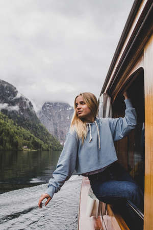 Konigssee. Bavaria. Germany. Blonde caucasian girl tries to touch the water from the window of the wooden boat on background of lake, forest & rock mountain in clouds in rainy spring day