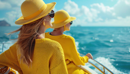 Two women wearing yellow sweaters and hats are enjoying a boat trip on a sunny day