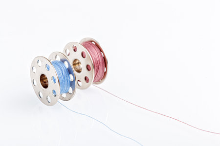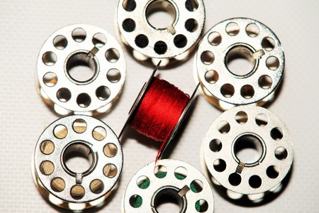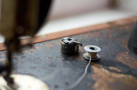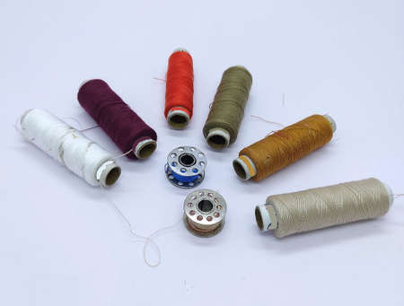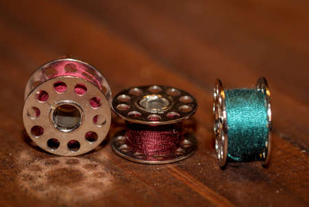 Old vintage hand sewing machine Colored thread coils or bobbin on white background, sewing machine accessories. selective focus. image