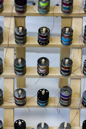 Colorful bobbins of thread on bobbin stand in tailor shop.