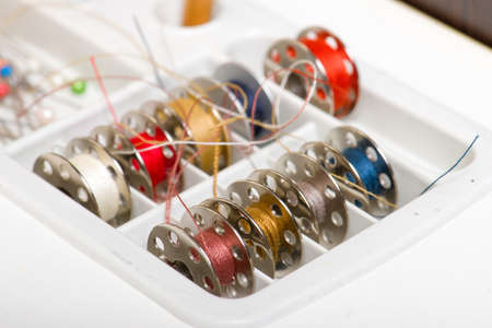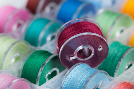 Colorful bobbins of thread in bobbin box in tailor shop.