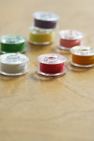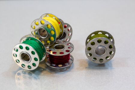 multicolored bobbins thread on the background of accessories for sewing close-up