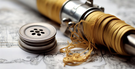 Spool of yellow old thread with thimbles staying on table closeup. Handmade.