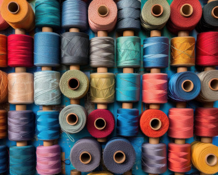 Colorful spools of thread arranged in a vibrant pattern on a blue background, showcasing various shades and textures