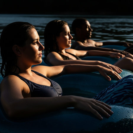 Friends float gently down a wide river on inner tubes, captured in harsh silhouette and rim lighting