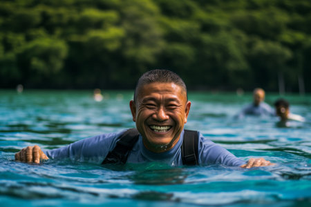 Portrait of a smiling Asian man in the water on a sunny day