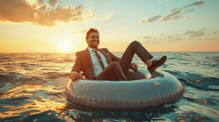 A happy man in a business suit on an inflatable circle in the sea. A long-awaited vacation. Hello summer!