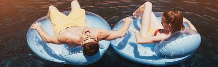 panoramic shot of young couple sunbathing on swim rings in swimming pool