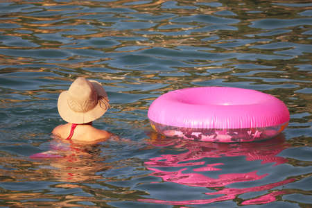 Girl in sun hat swimming in the sea near the inflatable circle. Beach leisure and vacation