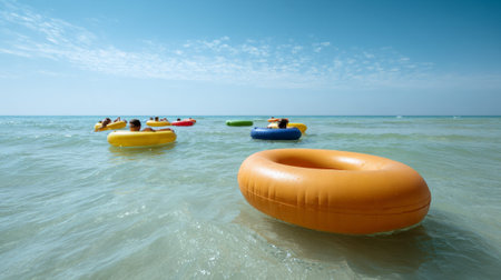 Tourists enjoying a leisurely summer day, floating on vibrant inflatable rings in the calm ocean waters beneath a bright blue sky, creating moments of joy and relaxation