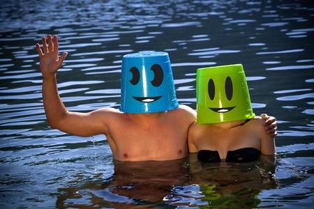 Happy couple in water with bucket on their head
