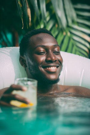 A cheerful young Black man enjoys a calm moment in the pool, holding a cocktail with a slice of lemon, surrounded by lush greenery.