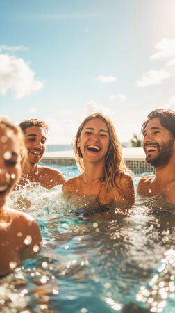 A bunch of joyful individuals are swimming in a pool and laughing collectively beneath the open sky
