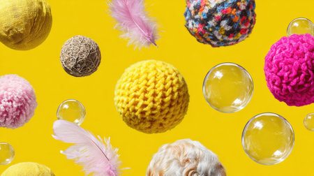 Colorful balls and feathers float in playful chaos with bubbles, creating a lively setting that shows fun and joy for pets and their toys