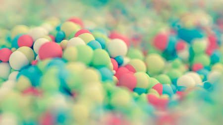 The Foam beads of various colors brightly colored on pink pastel background with empty space.