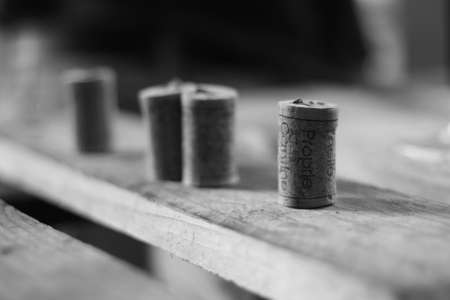 Corks in a row, black and white close up.