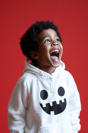 African American school-age boy in a spooky ghost outfit, laughing with a crazy expression, standing on a red background.