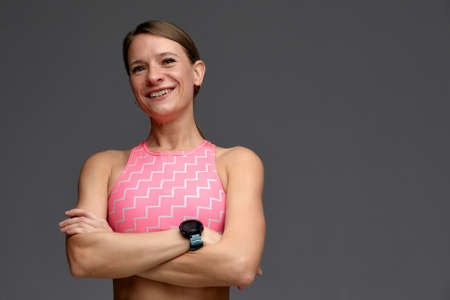 cheerful beautiful slim young woman wear sports uniform isolated on black, studio shoot. Healthy lifestyle