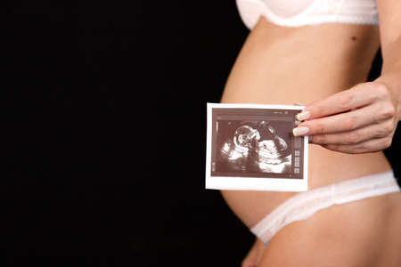 A pregnant woman in white lingerie holds an ultrasound photo in front of her belly. High quality photo