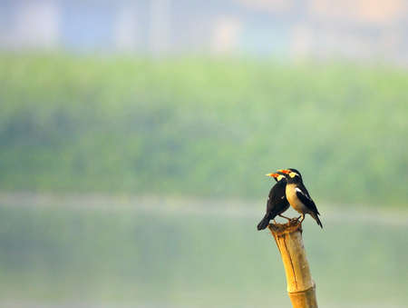 pied bush chat or saxicola caprata perched with beautiful colorful background at jim corbett national park or tiger reserve, uttarakhand, india