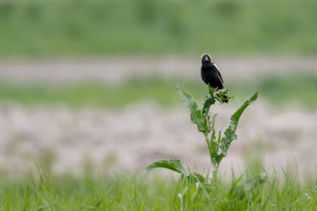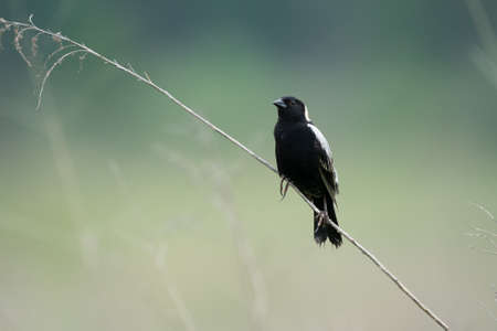 Black winged black bird (Aegithalos caudatus) perching on a blade of grass