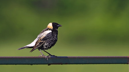A bobolink sings its bubbling, virtuosic song on a leafy tree top. With its beak wide open and a brilliant straw-colored patch on its head, the bobolink stands out in the blue prairie sky.
