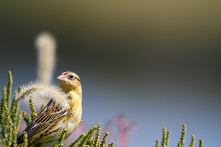 Bird, Black-headed Bunting, Emberiza melanocephala perched on a grass blade