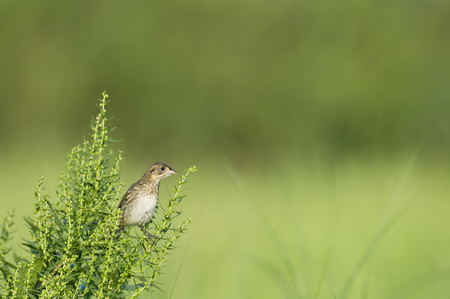 A Seaside Sparrow perches on a green bush on a bright sunny day with a smooth green background.