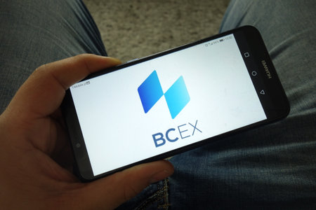 KONSKIE, POLAND - March 31, 2019: Man holding smartphone with BCEX cryptocurrency exchange logo