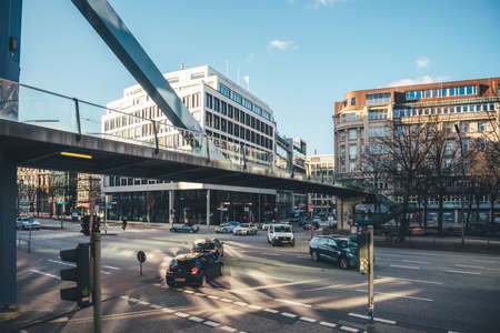 Hamburg, Germany - Mar 2018: Hamburg cityscape with Holzbrucke and Willy-Brandt Strasse street with lots of cars and pedestrians