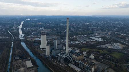 fossil fuels power plant, Generation of electricity by burning coals. Burning gas. Co2 climate change. Energy transistion. Aerial view.