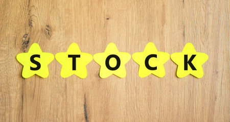 Stock symbol. Concept word Stock on beautiful yellow paper stars. Beautiful wooden table wooden background. Business lifestyle stock concept. Copy space.